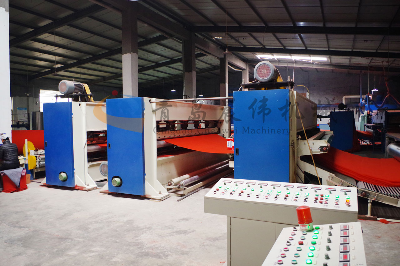 5. CWPW-鋪網(wǎng)機:用于將梳理纖網(wǎng)通過移動小車交叉折疊為所需幅寬和定量的多層纖網(wǎng),以供后道工序使用。鋪網(wǎng)輥采用特殊結(jié)構(gòu),加裝壓網(wǎng)輥和導流板,不飄網(wǎng)不起皺,五只大功率電機精確控制各部件的運動,電動輸出簾高度調(diào)節(jié)裝置