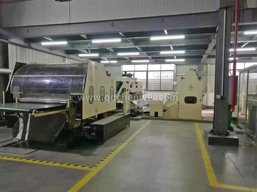 5. CWPW-鋪網(wǎng)機:用于將梳理纖網(wǎng)通過移動小車交叉折疊為所需幅寬和定量的多層纖網(wǎng),以供后道工序使用。鋪網(wǎng)輥采用特殊結構,加裝壓網(wǎng)輥和導流板,不飄網(wǎng)不起皺,五只大功率電機精確控制各部件的運動,電動輸出簾高度調(diào)節(jié)裝置