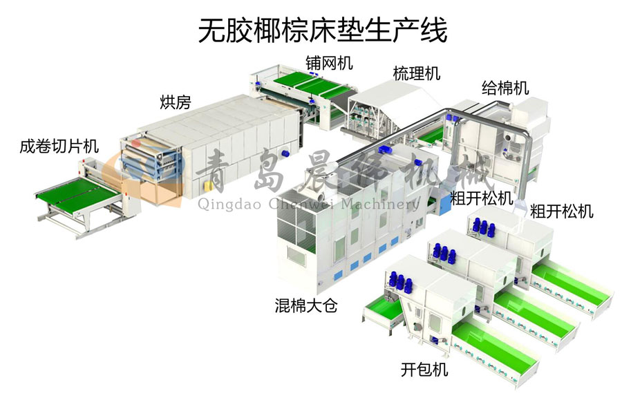 本生產(chǎn)線是利用椰棕纖維和膠水通過高溫?zé)犸L(fēng)穿透粘合定型,通過壓板機多層壓實而成,椰棕墊是床上用品、服裝家具、沙發(fā)高級的芯墊材料。
