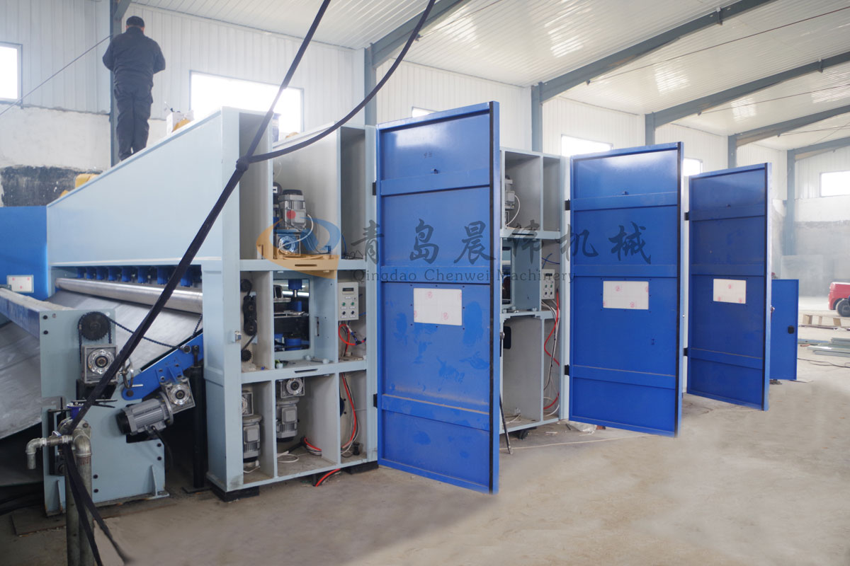4. CWSL-梳理機(jī):單錫林梳理機(jī)主要是將前道工序棉網(wǎng)層進(jìn)行單纖維狀態(tài)分散過程,并且等寬均勻的輸出到鋪網(wǎng)機(jī),單錫林梳理機(jī)適用于土工布、仿絲棉等無紡布生產(chǎn)線最核心部位。高速高產(chǎn),出網(wǎng)速度高,有效工作機(jī)幅寬,產(chǎn)量高梳理效果好,設(shè)備穩(wěn)定不易故障。